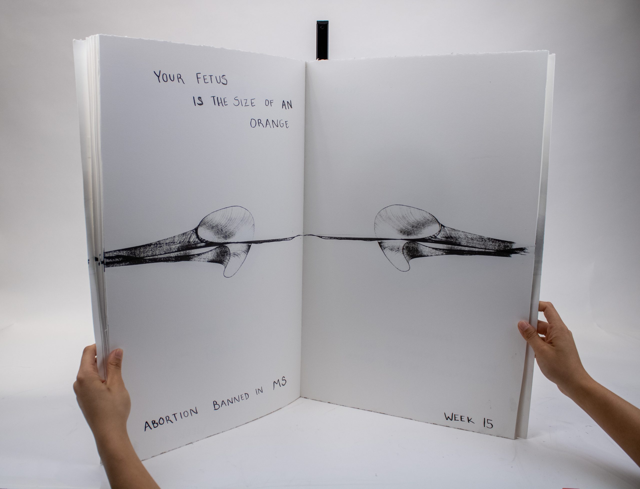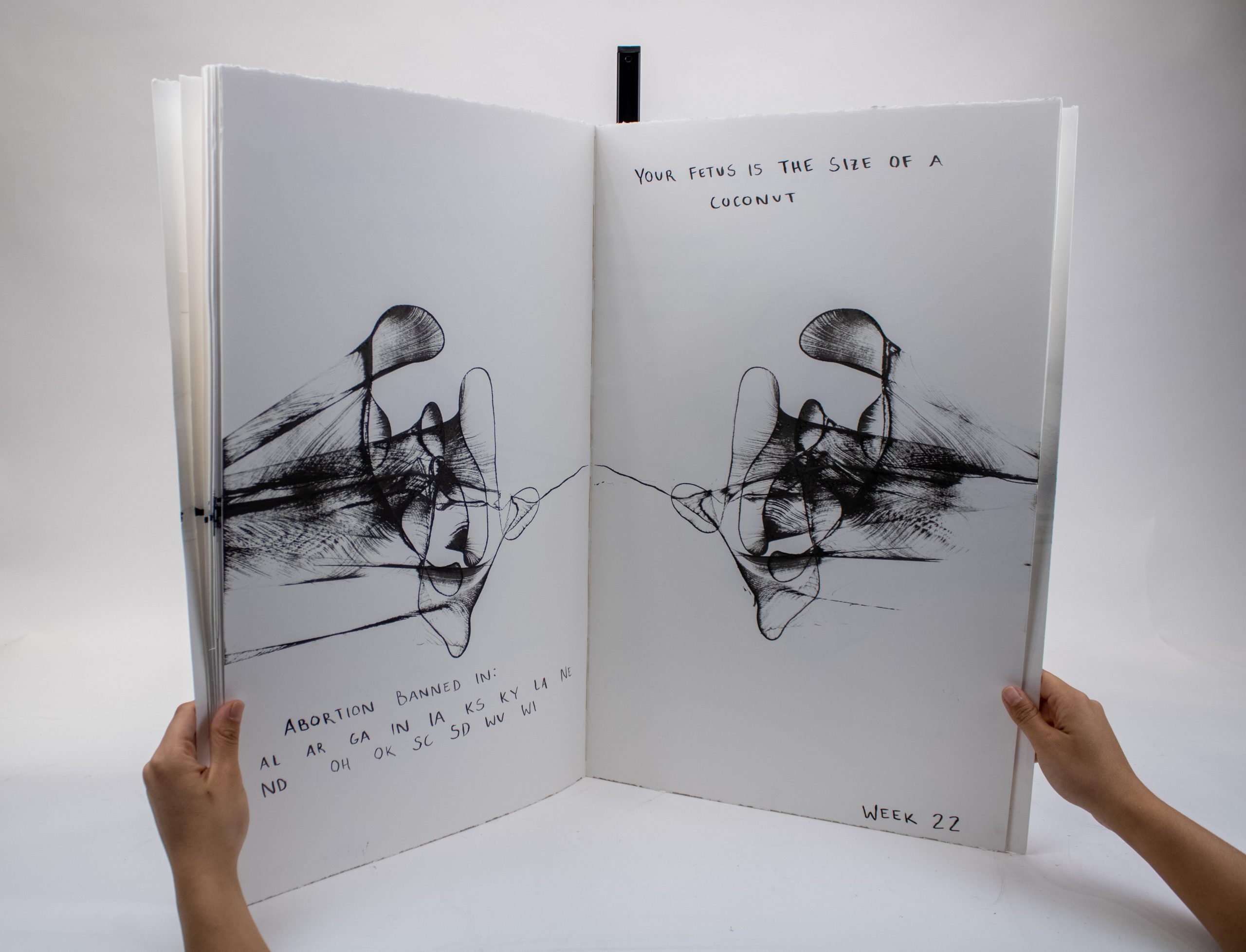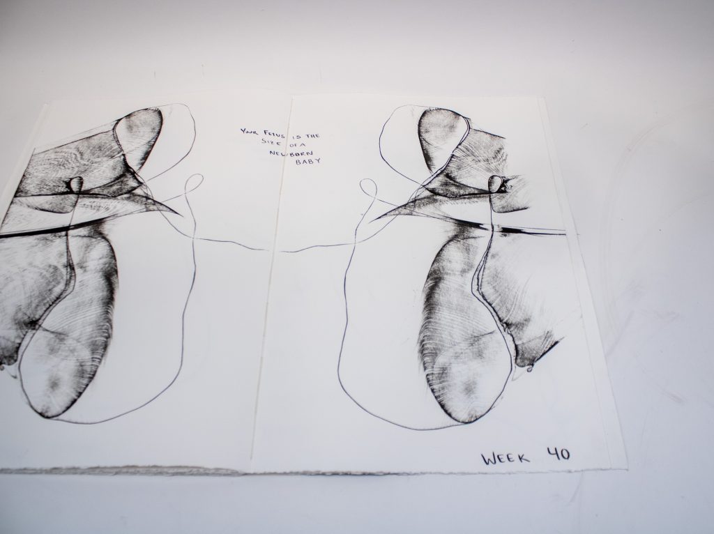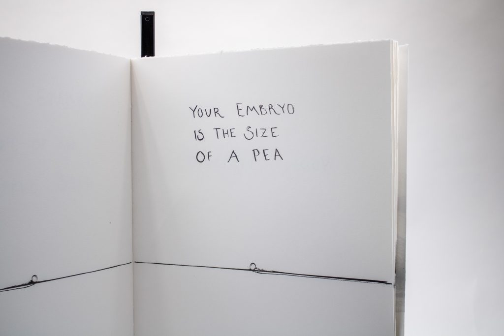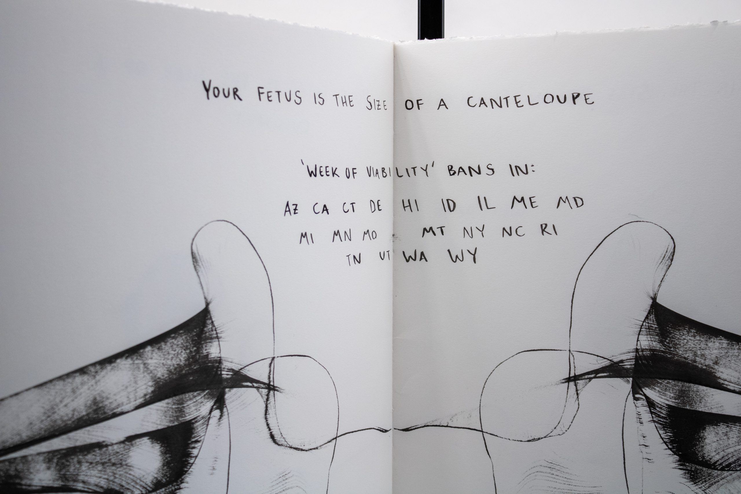 Artist’s Book documenting phases of fetal development to scale with commentary on the artist’s experience with pregnancy, birth, and abortion, as well as notes regarding the legality of abortion across U.S. states at each prenatal stage.