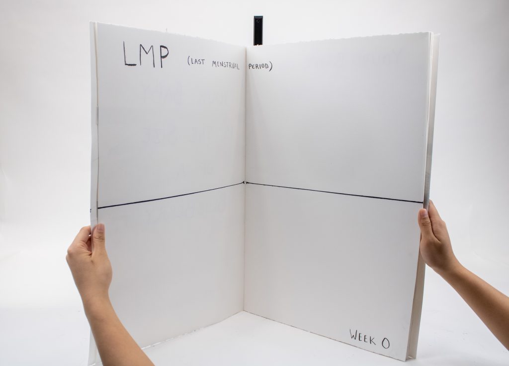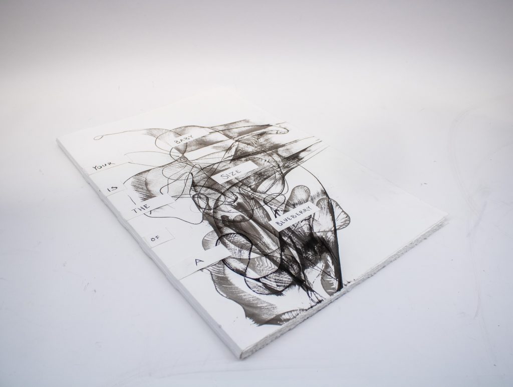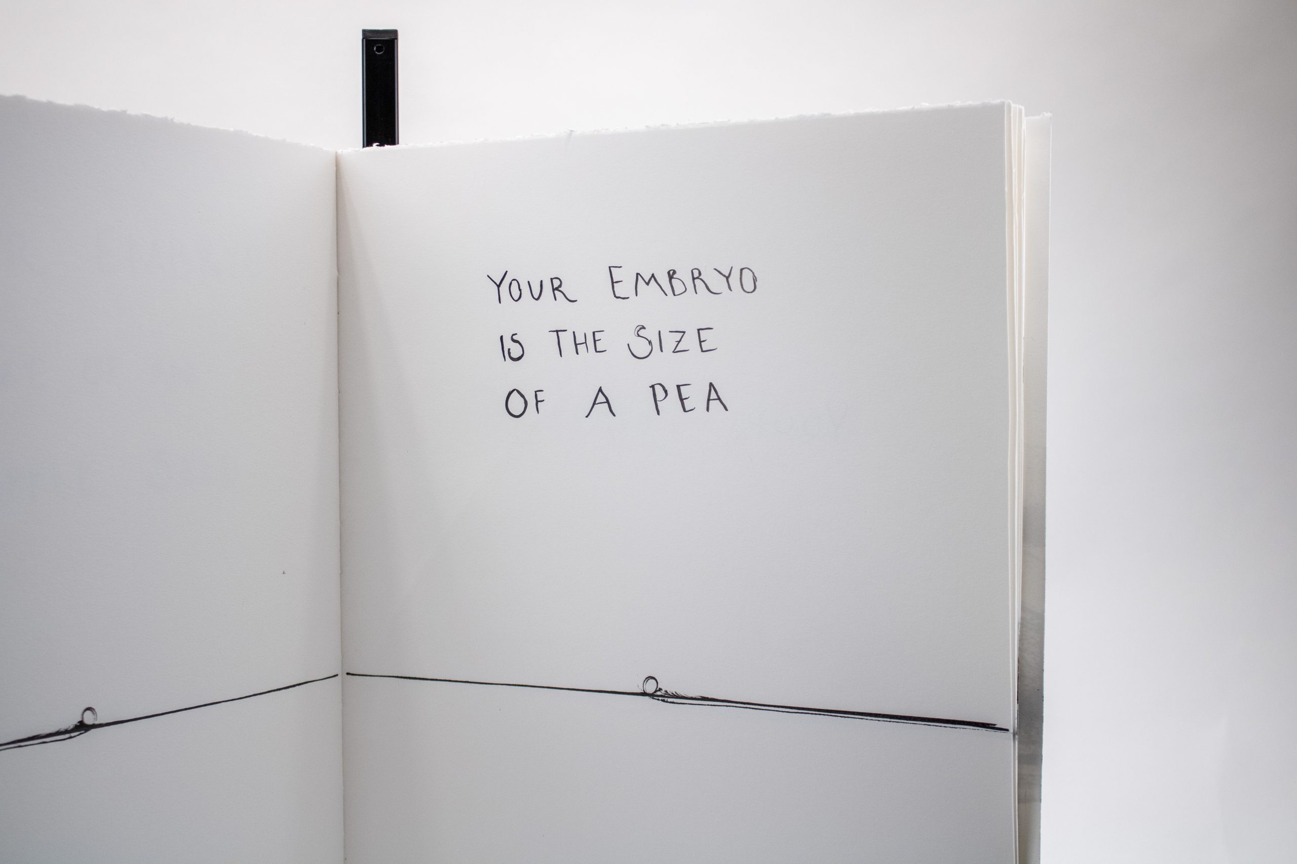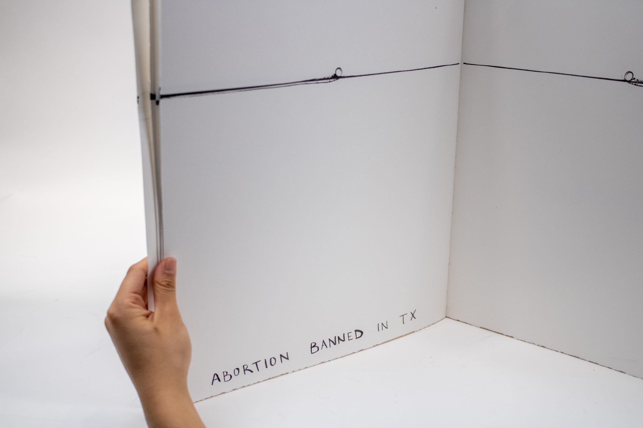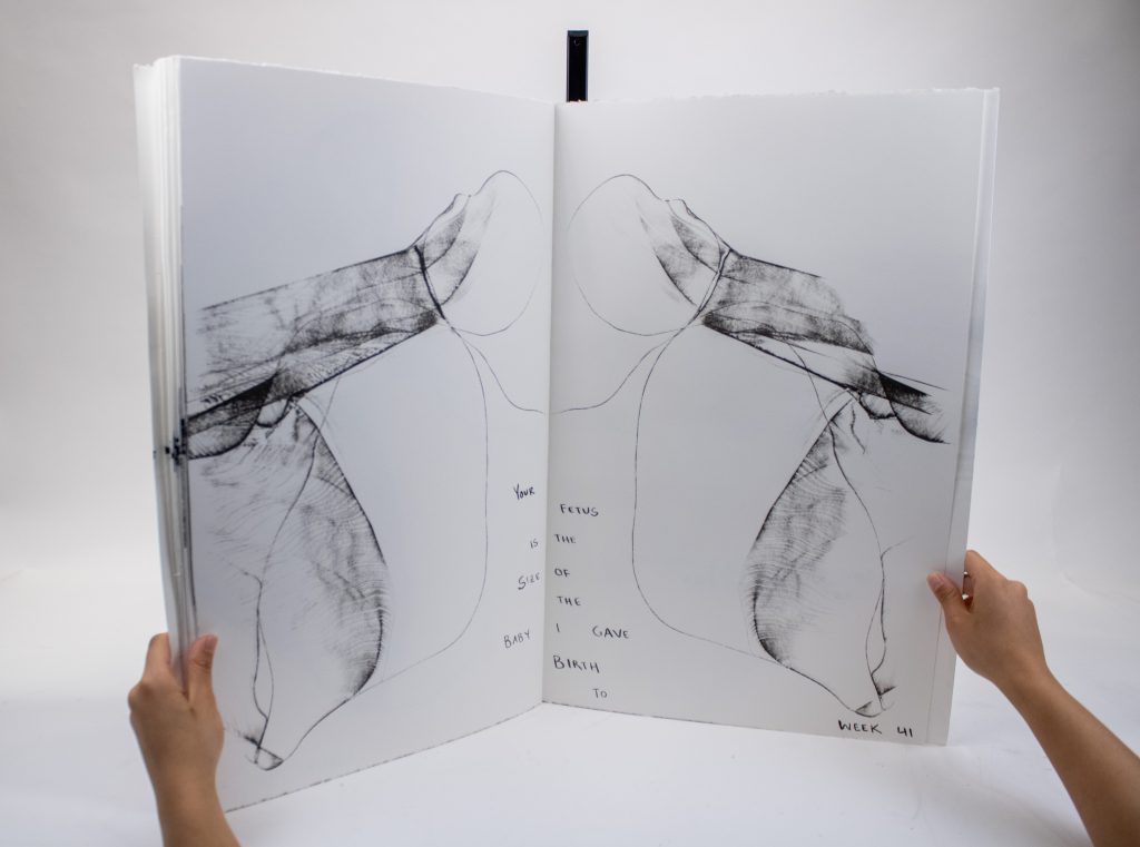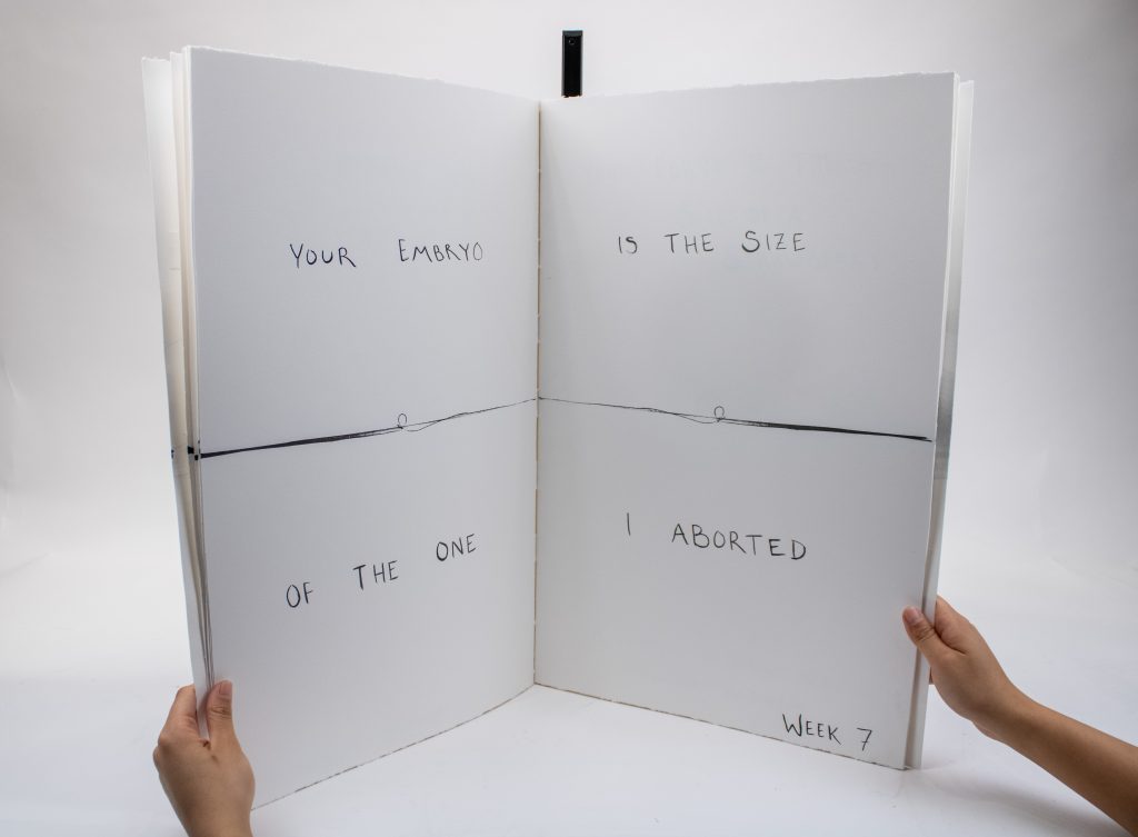Artist’s Book documenting phases of fetal development to scale with commentary on the artist’s experience with pregnancy, birth, and abortion, as well as notes regarding the legality of abortion across U.S. states at each prenatal stage.